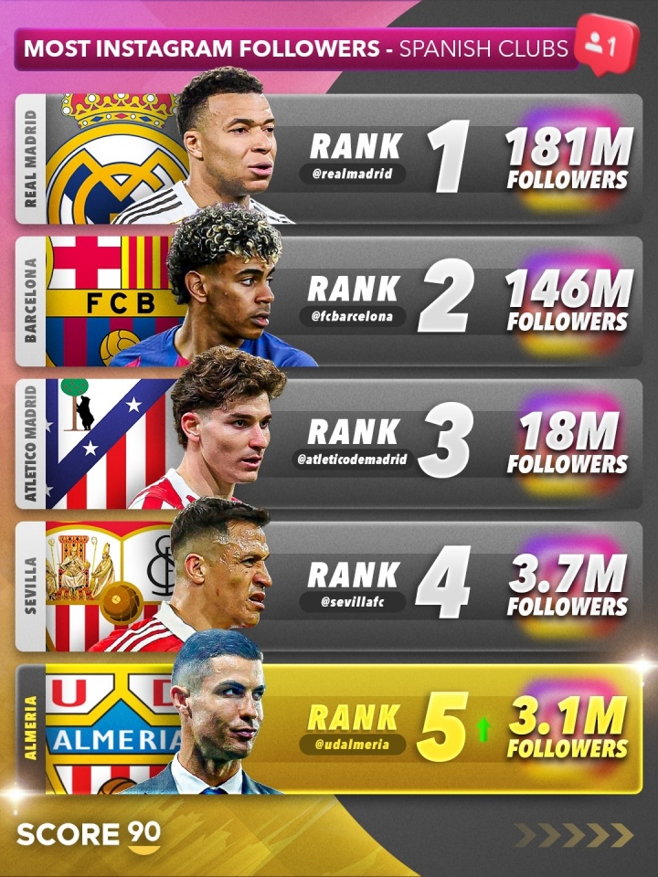 03月04日讯 据Score90统计,在C罗收购了西乙球队阿尔梅里亚25%的股份后,阿尔梅里亚的社媒粉丝数疯涨,如今阿尔梅里亚的IG账号已经拥有超过310万粉丝,在所有西班牙俱乐部中排名第五,而前四支球队均为西甲球队。
